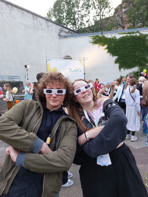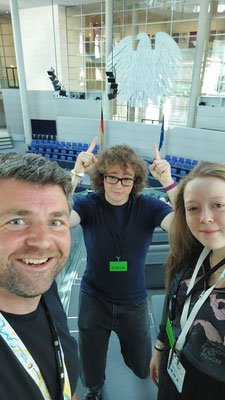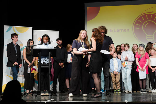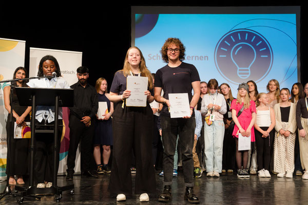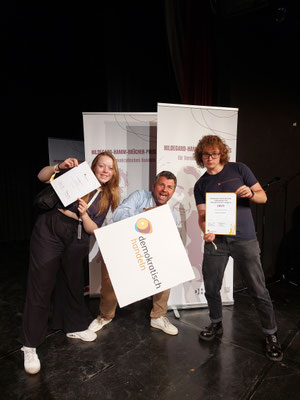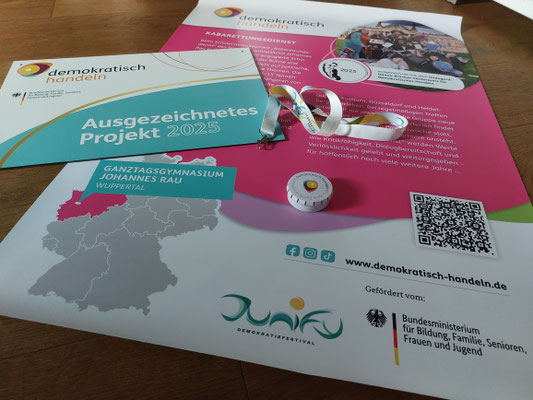 Der Kabarettungsdienst wurde von „Demokratisch Handeln“ mit dem bundesweiten Hildegard-Hamm-Brücher-Preis ausgezeichnet und dafür nach Berlin eingeladen. Bei dem Demokratie-Festival „Junify“ trafen sich insgesamt 50 Projekte aus ganz Deutschland, die Demokratieerziehung in besonderer Form leben. Die besondere Auszeichnung erhalten nur drei der Gewinnerprojekte, die eine besondere Strahlkraft haben, sodass wir sehr stolz auf diese Anerkennung sind, die Lena und Lino in Berlin in Empfang nehmen durften. In der Laudatio hieß es: „Beim Kabarettungsdienst werden Werte wie Kritikfähigkeit, Dialogbereitschaft und Verlässlichkeit gelebt und weitergegeben – für hoffentlich noch viele weitere Jahre.“